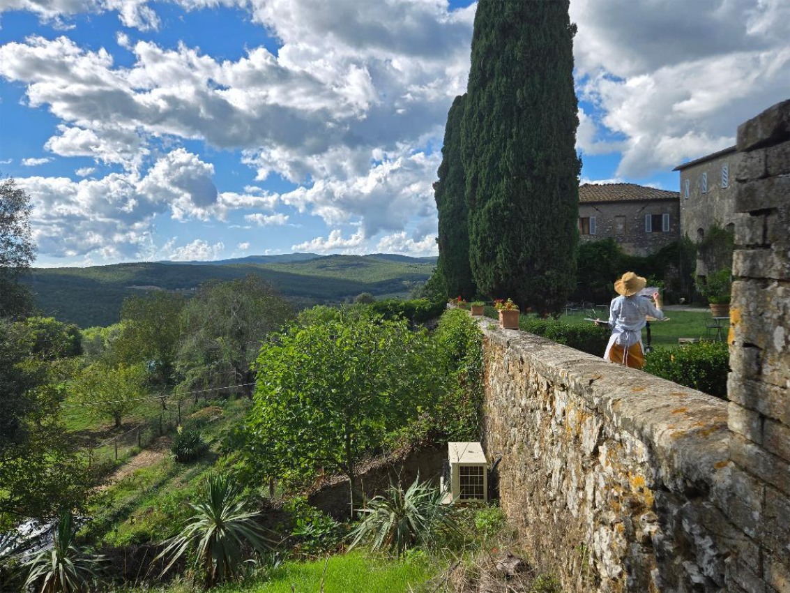 The total course fee for the 2026 Dean Fisher Tuscany, Italy, landscape painting workshop is $4,500 USD per week. (reduced rate if you choose to stay for both weeks) There is a $500 supplement for private rooms. Additionally, there will be a $350 discount when a non-painting spouse or partner attends. This includes three wonderful meals a day, all chef prepared from ingredients which are exclusively grown on this 1,100 acre, completely organic farm